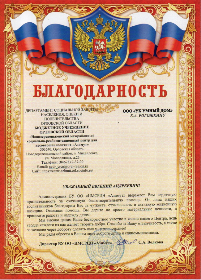 В эти выходные сотрудники УК Умный дом посетили Юнармия Новосиль и Новодеревеньковский межрайонный социально-реабилитационный центр для несовершеннолетних "Азимут".